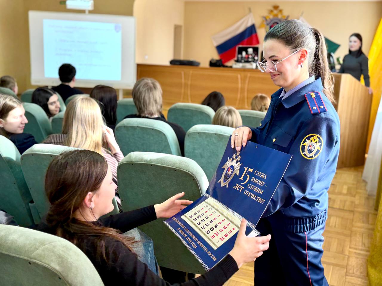 Встреча началась с выступления исполняющей обязанности помощника руководителя управления (по общественно-политической работе) Анны Григорьевой, которая рассказала о специфике деятельности Следственного комитета Российской Федерации. Учащимся был продемонстрирован видеофильм о коллективе и работе следственного управления, подготовленный к 15-летию ведомства.