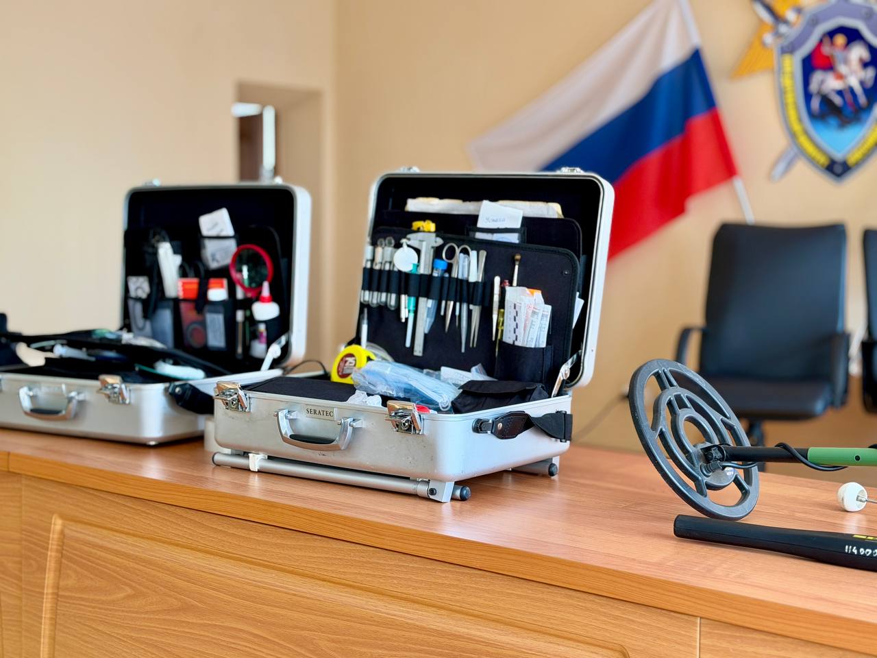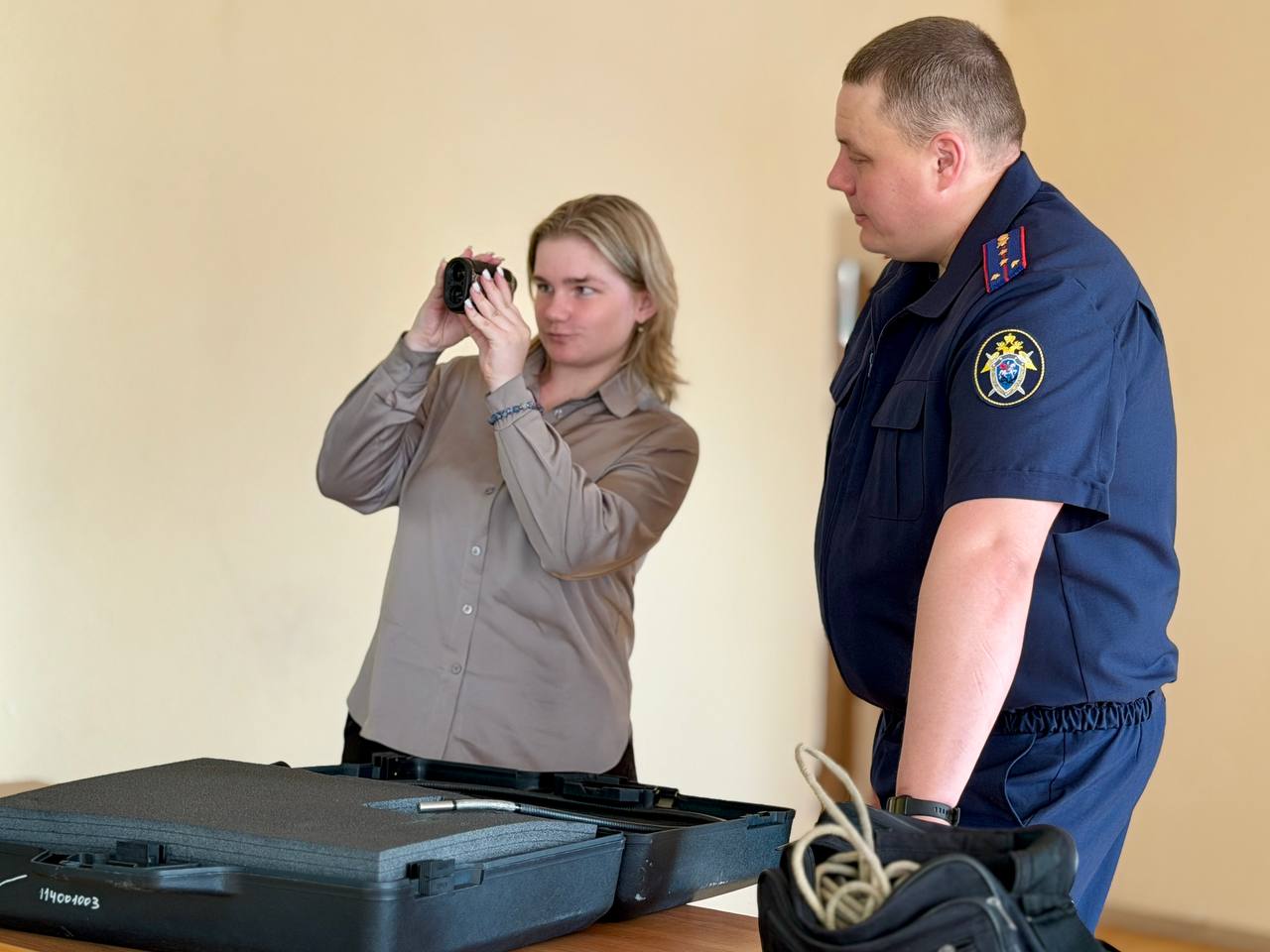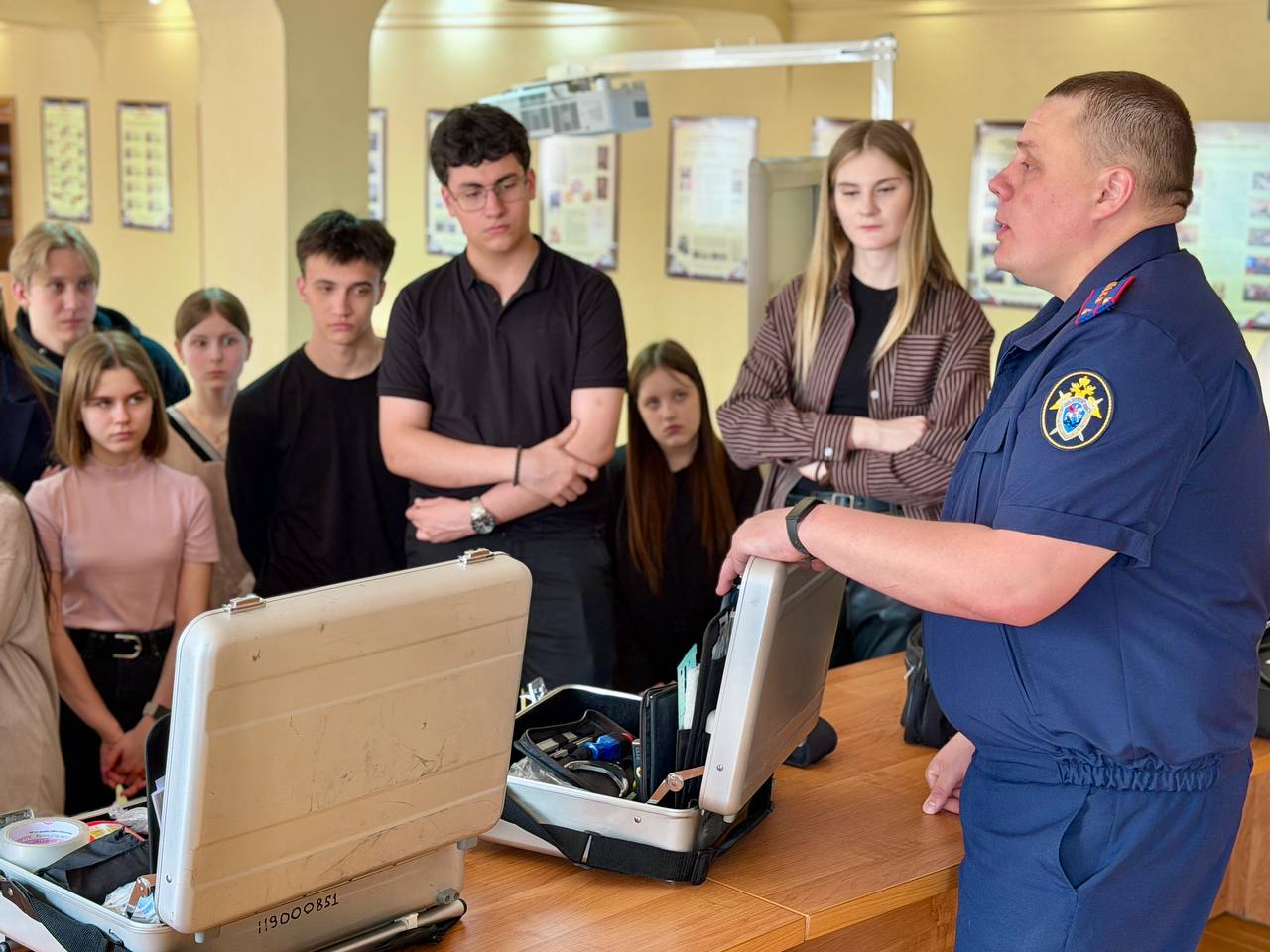 Особый интерес у гостей вызвала беседа со старшим следователем-криминалистом следственного управления Дмитрием Делягиным. Он продемонстрировал ученикам некоторые образцы современного криминалистического оборудования, применяемого с целью обнаружения, изъятия и фиксации следов преступления, а также содержимое следственного (криминалистического) чемодана. На примерах из собственной следственной практики, он рассказал школьникам, как криминалистическая техника помогает раскрывать преступления.