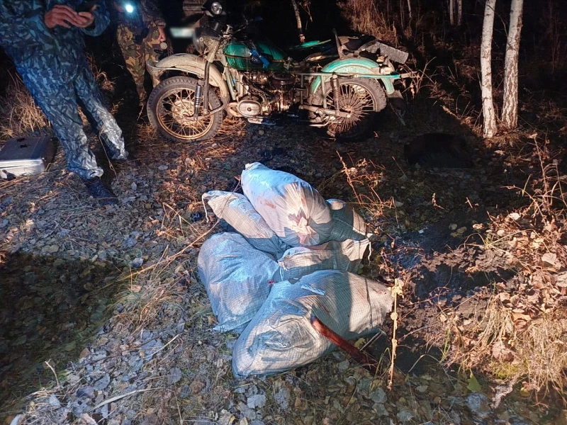 В лесном массиве охотоведы заметили следы от колёс мотоцикла и услышали выстрелы. Вскоре они увидели мотоцикл, на котором передвигались двое мужчин. Намереваясь скрыться от охотоведов, гражданин, который сидел на заднем пассажирском сидении, спрыгнул и побежал в лес, а водитель мотоцикла продолжил движение. В результате преследования оба гражданина были задержаны. У них обнаружены семь мешков с мясом диких животных.