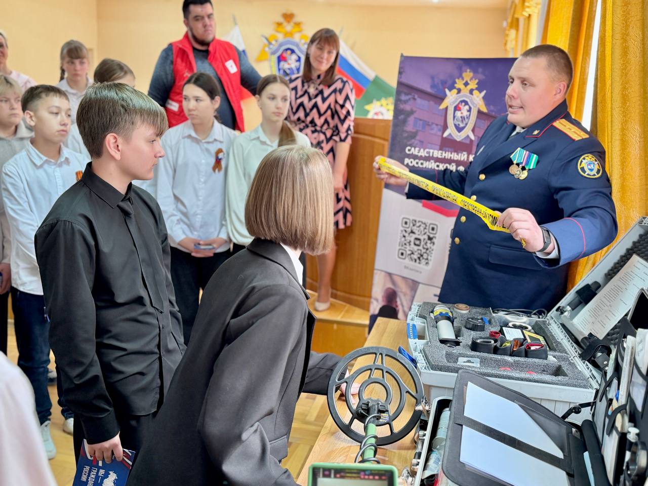 После официальной части мероприятия ребята смогли ближе познакомиться с профессией следователя. Школьники посмотрели видеоролик о работе курганских следователей и пообщались со следователем–криминалистом следственного управления Дмитрием Делягиным, который рассказал о том, как современная криминилистическая техника помогает раскрывать преступления.