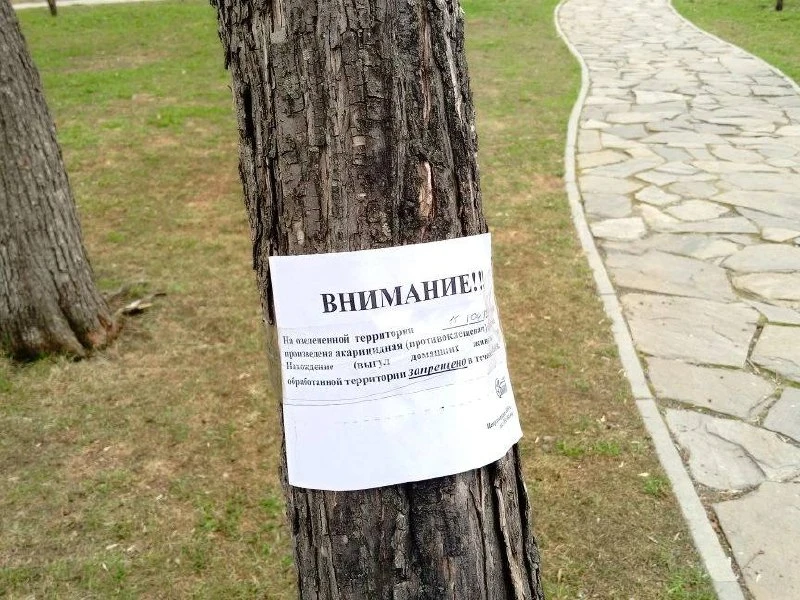 На местах, где провели обработку, повесили уведомления о запрете выгула животных в течение нескольких дней.