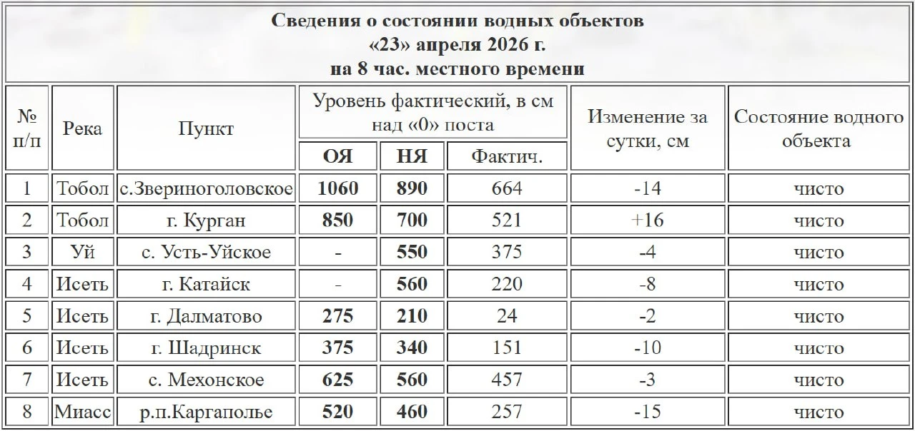 На 8:00 23 апреля он достиг отметки 521 см. В Звериноголовском река убавила 14 см, её уровень составил 664 см.