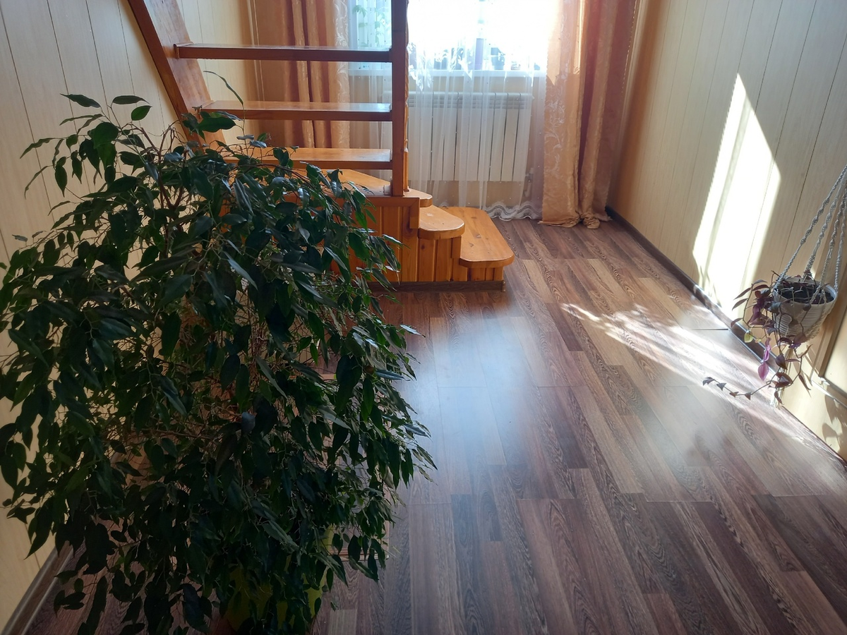 Балкон является настоящим раем для растений. Здесь — простор, два больших окна и всё необходимое для комфортного роста. Цветы располагаются не только на полу, но и в подвесных кашпо, создавая невероятный ландшафт. Фикус Валера, самый крупный гость с высотой почти полтора метра, занимает почетное место у стены. Есть еще и калла, которая перед выходом на улицу теряет лишнюю тяжесть, ведь её листья часто ломаются зимой.