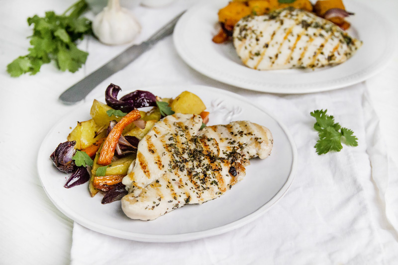 Шаг 5: На тарелку выложить куриные стейки и запеченные овощи, полить соусом из маслин и украсить оставшейся петрушкой. Подавайте горячими и наслаждайтесь!