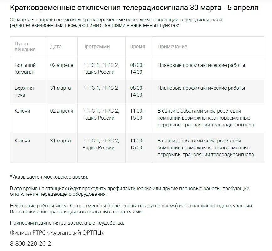 30 марта - 5 апреля возможны кратковременные перерывы трансляции телерадиосигнала радиотелевизионными передающими станциями в населенных пунктах: