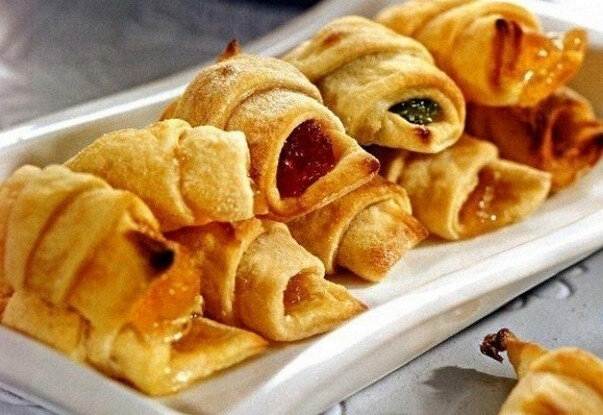 Сначала все ингредиенты смешивают до получения однородного эластичного теста, которое легко раскатывается.Раскатать тесто в пласт толщиной около 5 мм. Из этого пласта нарезать полоски шириной 5-7 см. Фруктовый мармелад следует нарезать на брусочки длиной примерно 3-5 см (в зависимости от ширины теста) и аккуратно завернуть в тесто.На заранее подготовленный поверхность, присыпанную мукой, выложить полученные трубочки. Выпекать в духовке, разогретой до 180 градусов, в течение 15-20 минут до золотистой корочки.Насладитесь результатом