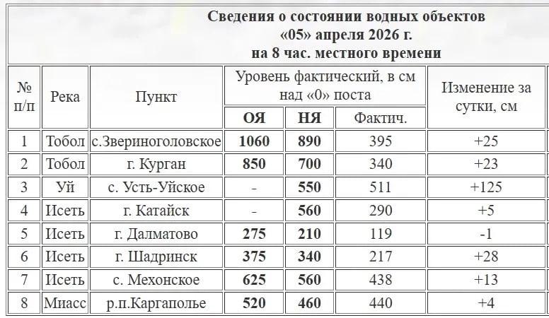 Сейчас уровень реки составляет 340 см над нулем поста. В селе Звериноголовское — 395 см (+25 см за сутки).