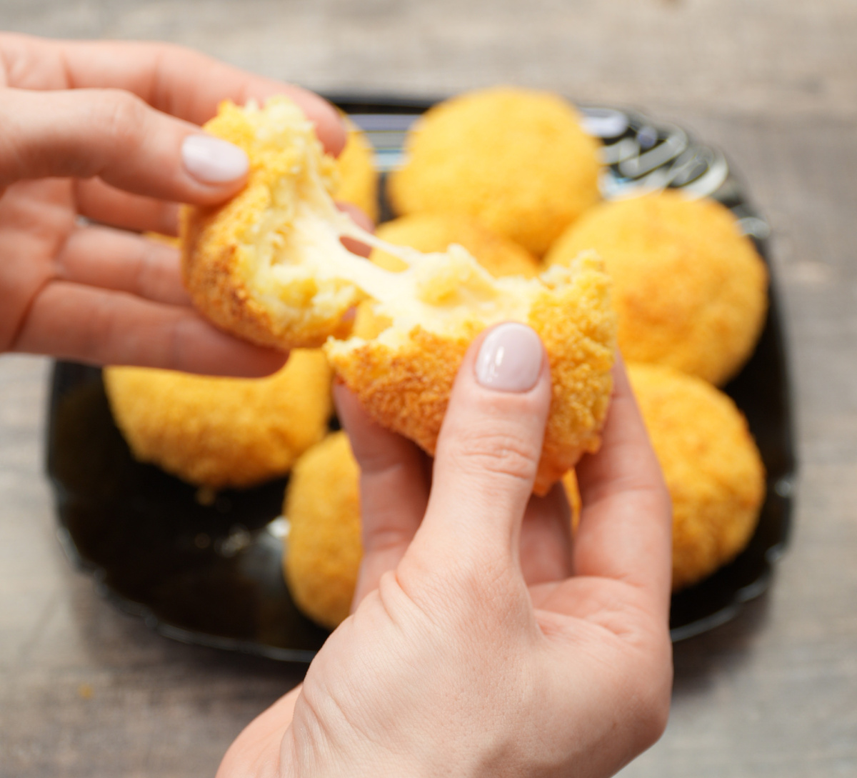 Готовые шарики обваливаются в панировочных сухарях, которые придают им аппетитную корочку при запекании. Выложить их на решетку аэрогриля, оставляя промежутки между ними, и готовить при 180 градусах около 20 минут. Чтобы добиться более румяной корочки, можно слегка сбрызнуть шарики растительным маслом перед процессом запекания. После достижения золотистого цвета, шарики стоит достать из аэрогриля и дать им немного остыть, чтобы горячий сыр не обжег рот.