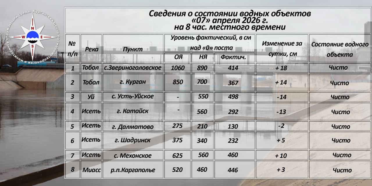 Весеннее половодье – 2026Данные Курганского ЦГМС по уровням воды в реках региона на 8:00 7 апреля.Уровень воды в реке Тобол:- в районе Кургана – 367 см. +14 см за последние сутки. Неблагоприятные явления наступают при уровне 700...