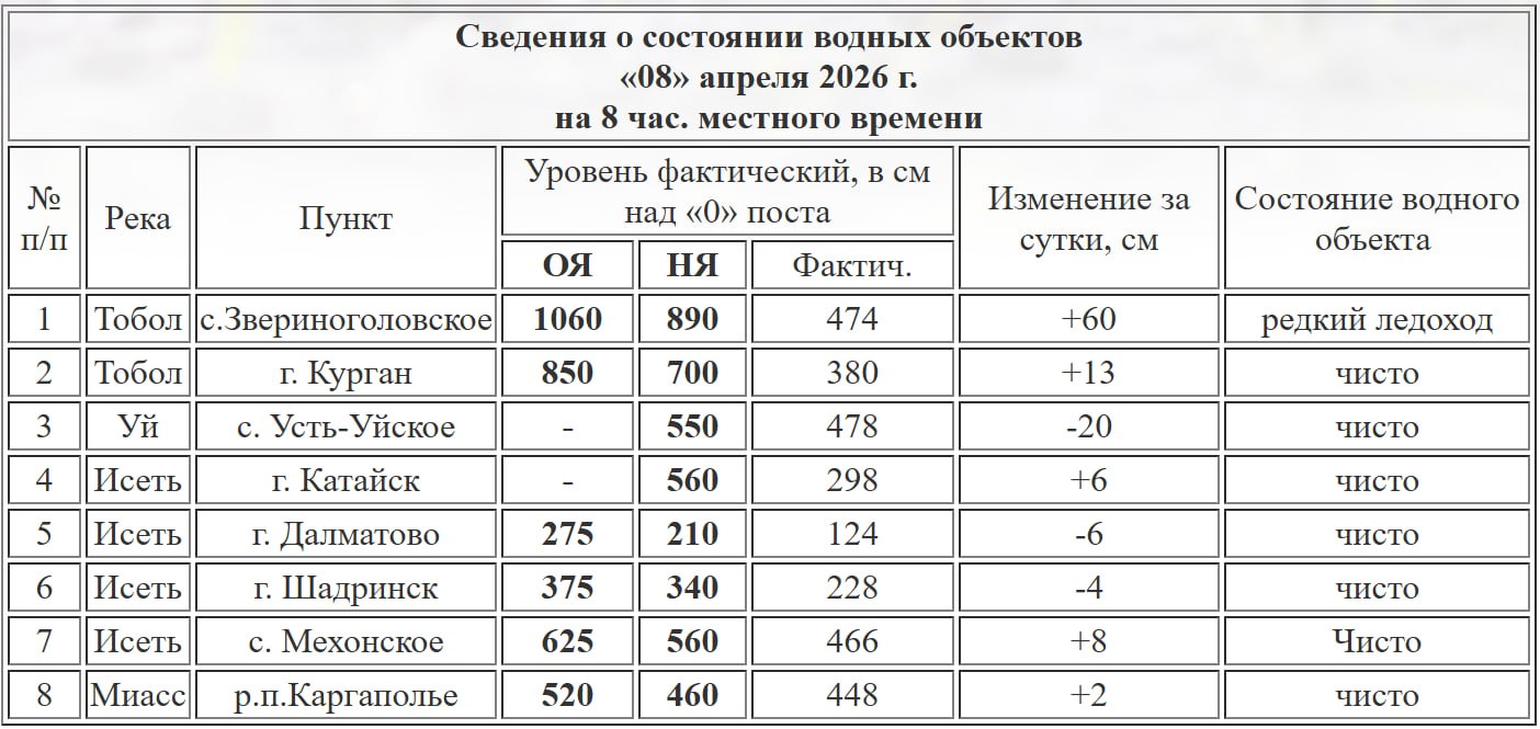За сутки он прибавил 13 см. В Звериноголовском уровень реки составил 474 см (+60 см за сутки).
