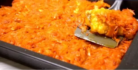 После этого можно приступить к приготовлению морковного соуса. Лук нарезается кубиками, а морковь натирается на терке. В глубокой сковороде или воке, с добавлением масла, нужно сначала обжарить лук до полупрозрачности, затем добавить морковь и готовить до мягкости овощей. На завершающем этапе добавьте кетчуп и приправьте по вкусу.
