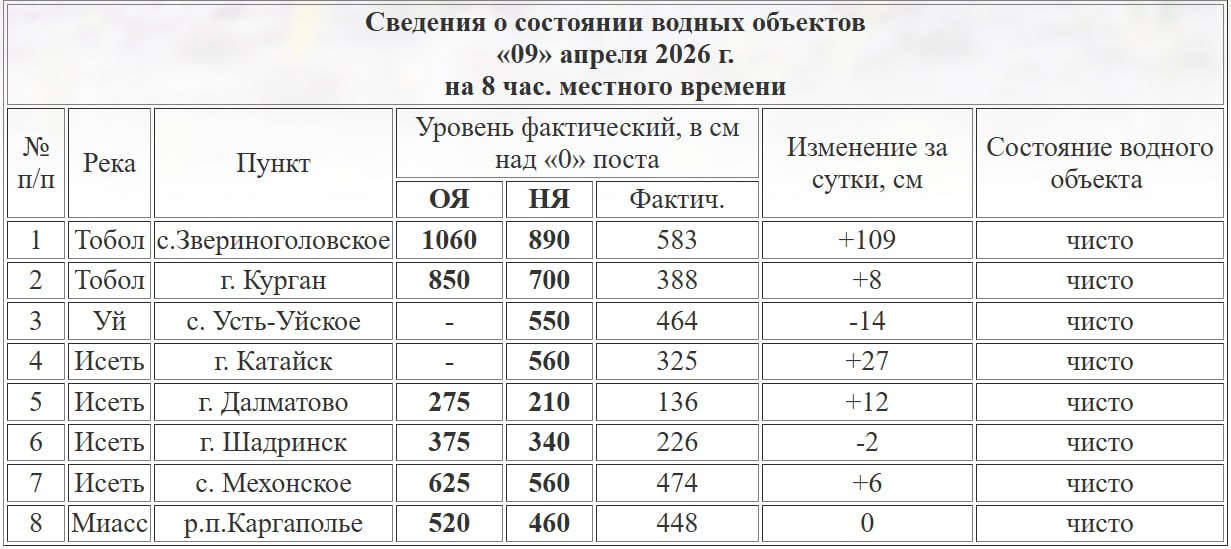 За сутки он прибавил 8 см. В Звериноголовском уровень реки составил 583 см (+109 см за сутки).