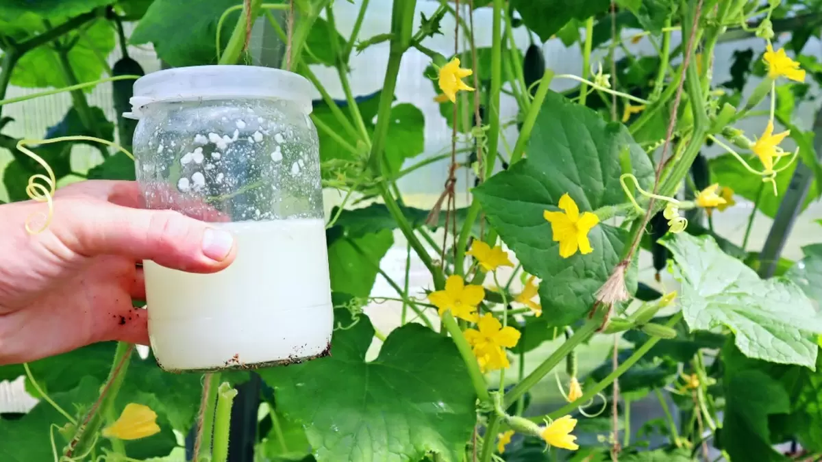 - Молоко: Этот продукт является настоящей находкой в садоводстве. Согласно исследованиям, молоко помогает сократить распространение грибковых заболеваний у огурцов и кабачков до 50%. Оно способствует ускорению роста растений благодаря содержанию аминокислот. Для приготовления откройте два стакана молока и разведите в 10 литрах воды.