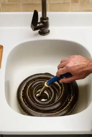 Если такие инструменты, как вантуз или обычный крючок, не привели к улучшению, и в кухонной мойке образовался плотный засор, сантехнический трос станет вашим спасением. Сначала разберите сифон, затем вставьте трос до упора в засор и начните вращать ручку, одновременно подавая трос вперед-назад. Это поможет разрушить даже самые устойчивые отложения. После очистки обязательно промойте трубы горячей водой, чтобы убрать остатки грязи.