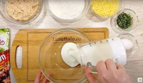 Приготовление теста начнется с 200 мл кефира (желательно 3,2% жирности). Кефир необходимо соединить с одним яйцом и добавить немного соли. Перемешать смесь венчиком для достижения однородной массы.