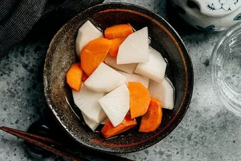 Этот маринованный дайкон с морковью станет отличным дополнением к мясным и рыбным блюдам, идеально открывая аппетит благодаря своей освежающей кисло-сладкой гамме.