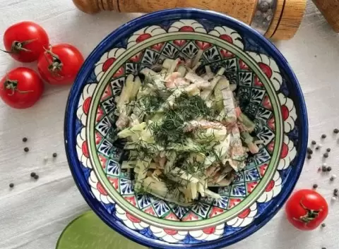В этом выпуске кулинарной рубрики предлагается удивительно яркий восточный салат под названием «Бахор», что в переводе с тюркского обозначает «Весна». Рецепт этого салата был представлен Аленой Коваленко, автором популярного блога «Мама готовит» в Одноклассниках.