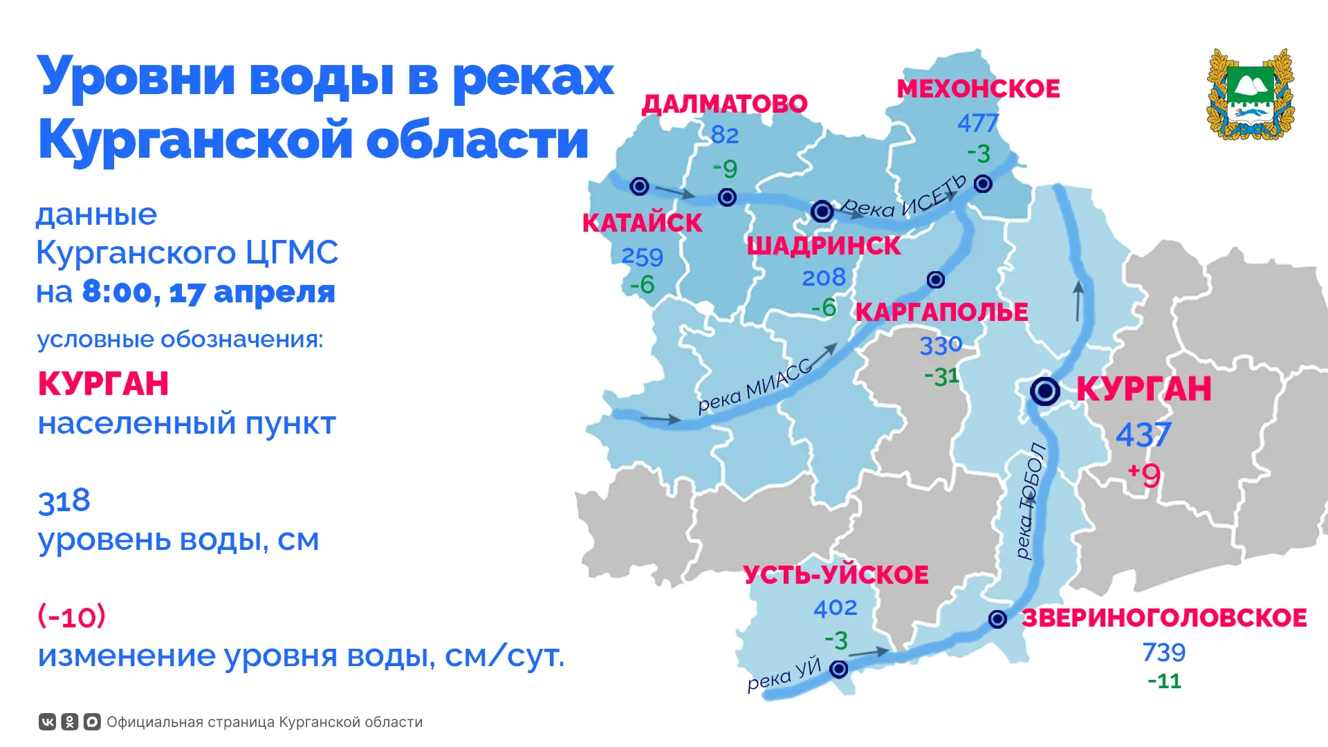 Данные Курганского ЦГМС по уровням воды в реках региона на 8:00 17 апреля.