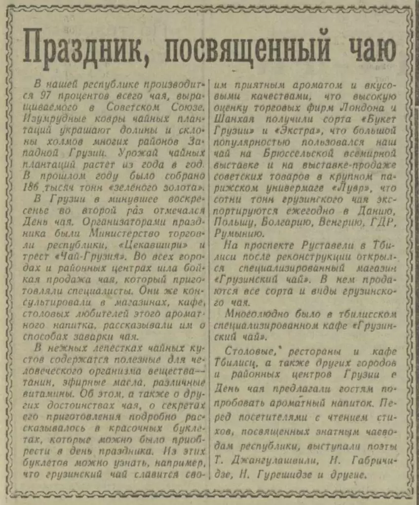 Изначально День чая был задуман не только как дань уважения самому напитку, но и как праздник работников чайной индустрии. В Грузии, где производилось большинство советского чая, этот день впервые и отмечался. Однако вскоре праздник вышел за пределы Грузии, оставив свои профессиональные корни позади. Хотя в крупных городах страны его отмечали, праздник так и не стал по-настоящему популярным. Многие, как и автор этой статьи, даже не узнали о его существовании до недавнего времени, благодаря каналам, освещающим советскую чайную культуру.