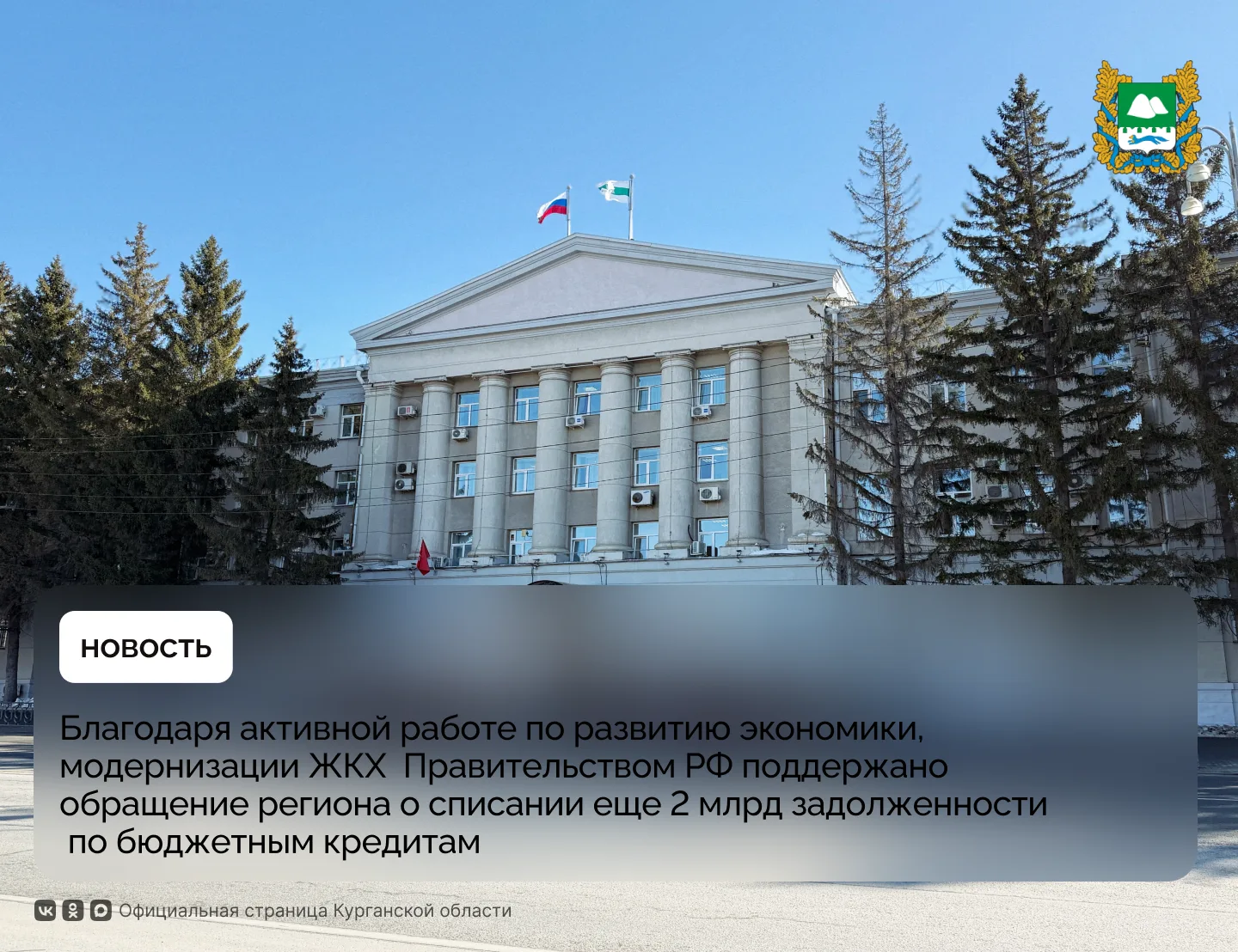 Благодаря активной работе Курганской области по развитию экономики, модернизации объектов ЖКХ и переселению граждан из аварийного жилья, в которые регион вкладывает собственные средства, Правительством РФ поддержано обращение, направленное по поручению губернатора Вадима Шумкова о списании Минфином России еще 2 млрд задолженности по бюджетным кредитам, ранее привлеченным из федерального бюджета. Соответствующая информация и подписанное Председателем Правительства РФ Михаилом Мишустиным распоряжение размещены на сайте Правительства РФ.