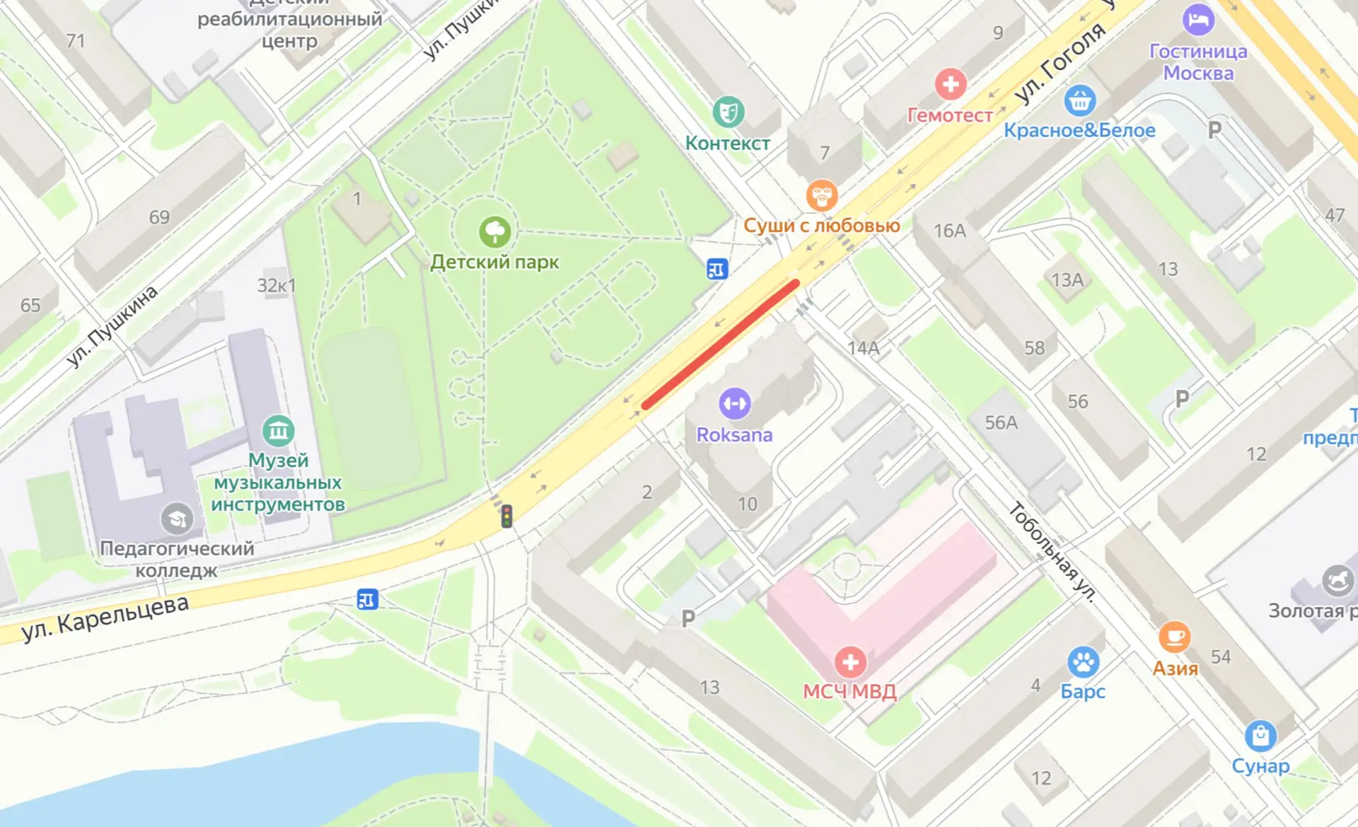 С 20 апреля на участке у дома №10 по Гоголя начнут устранять аварию на коллекторе. Из-за работ дорогу в сторону улицы Тобольной сузят. Ограничение продлится до 3 мая.