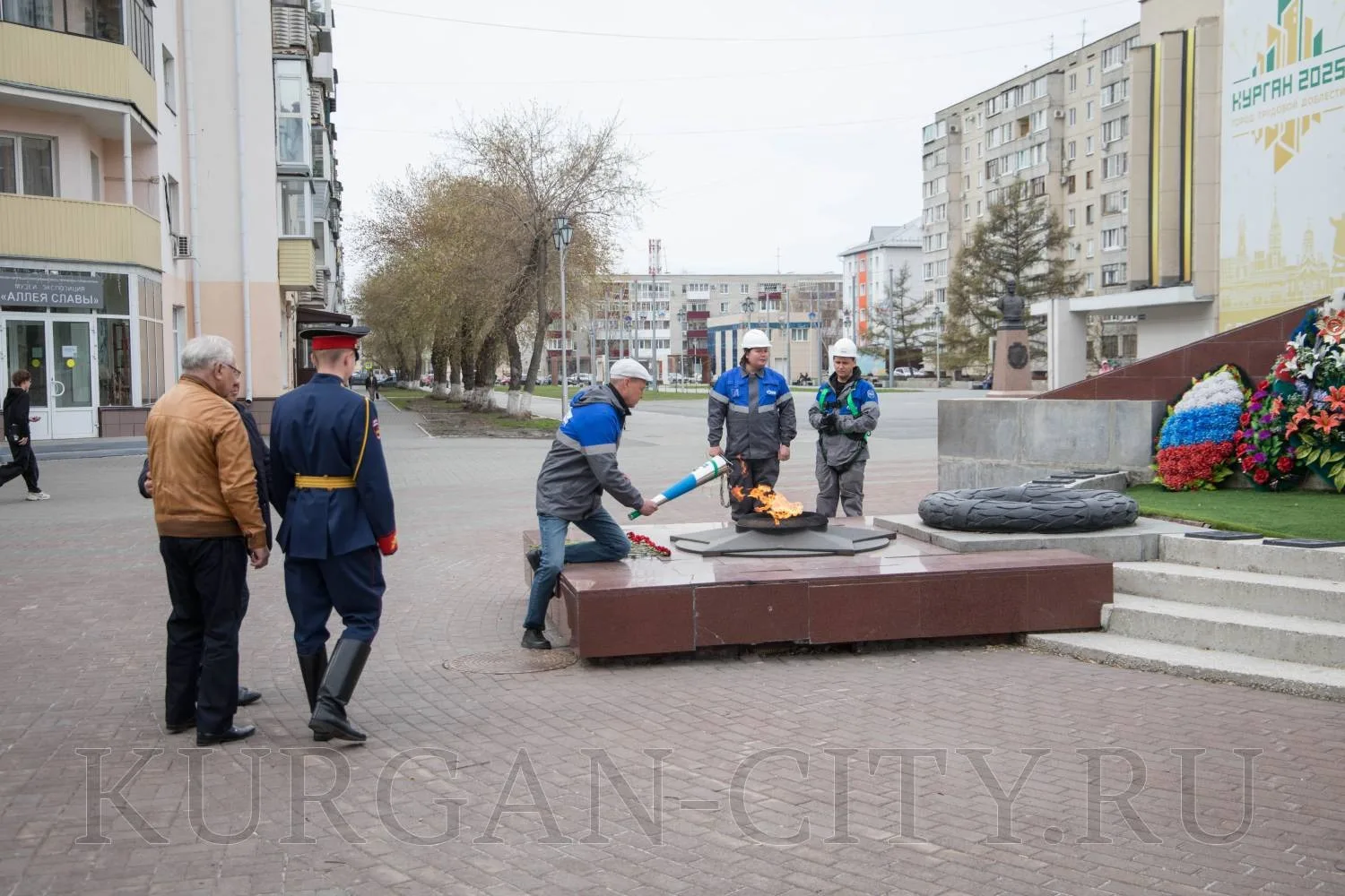 Сегодня, 20 апреля, в Кургане проводится техническое обслуживание Вечного огня на мемориальном комплексе на Аллее Славы. Это ежегодное мероприятие, которое организуют специалисты АО «Газпром газораспределение Курган» накануне Дня Победы. На время проведения профилактических работ Вечный огонь был перенесен на временную горелку с помощью специального факела. В этом году в церемонии переноса приняли участие председатель Курганского городского совета ветеранов Владимир Дударев, директор АО «Газпром газораспределение Курган» Олег Попов и кадет школы №75 Илья Сотников.