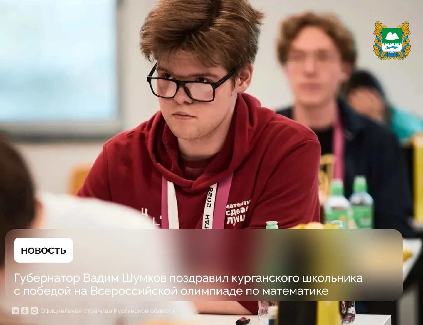 Губернатор Вадим Шумков поздравил ученика 27-й гимназии города Кургана Степана Карпова с победой на Всероссийской олимпиаде школьников по математике. Кроме того, глава региона поручил департаменту образования и науки Курганской области проработать механизм поощрения талантливых школьников – победителей и призёров олимпиад.