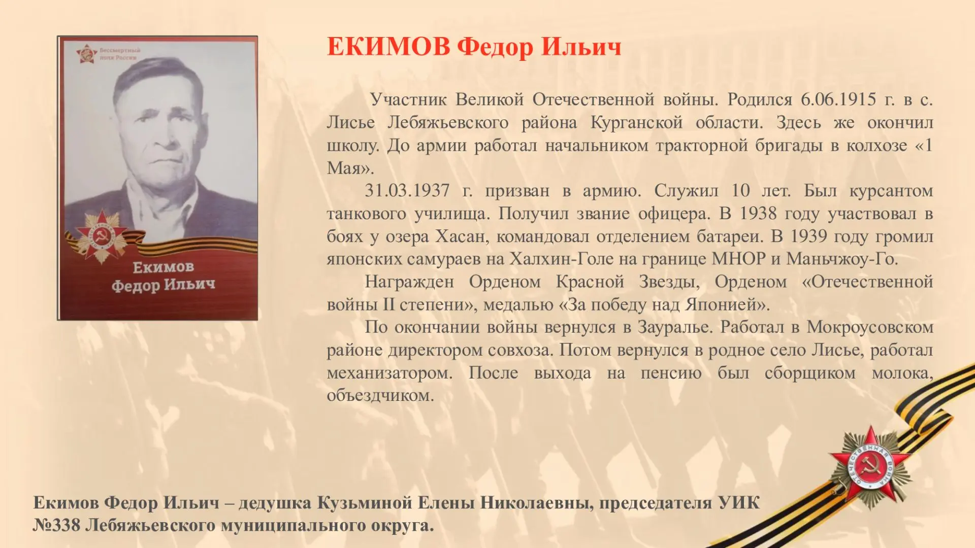 «В этом человеке уживалась и строгость, и доброта одновременно. Любил порядок во всем. И нас, своих внуков, с детства приучал к этим качествам. Сколько судеб погубила война, сколько сердец истерзала. Я очень рада, что они с моей бабушкой прожили долгую жизнь. Думать об этом больно, но и не думать – нельзя», – отмечает внучка Федора Ильича Екимова – Кузьмина Елена Николаевна, председатель УИК №338 Лебяжьевского муниципального округа.