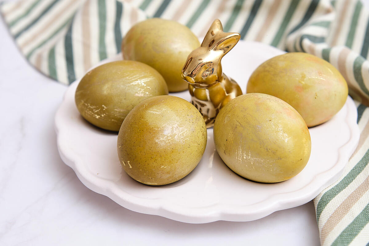 Приступая к процессу, яйца нужно хорошо промыть, поместить в кастрюлю и залить холодной водой так, чтобы она покрывала их примерно на 1-2 см. Затем пакетики чая и куркуму следует добавить в кастрюлю, поставив ее на плиту. После закипания варить 10 минут, затем снять с огня и оставить на час в отваре. Как только время пройдет, яйца нужно аккуратно извлечь из раствора и обсушить на салфетке.