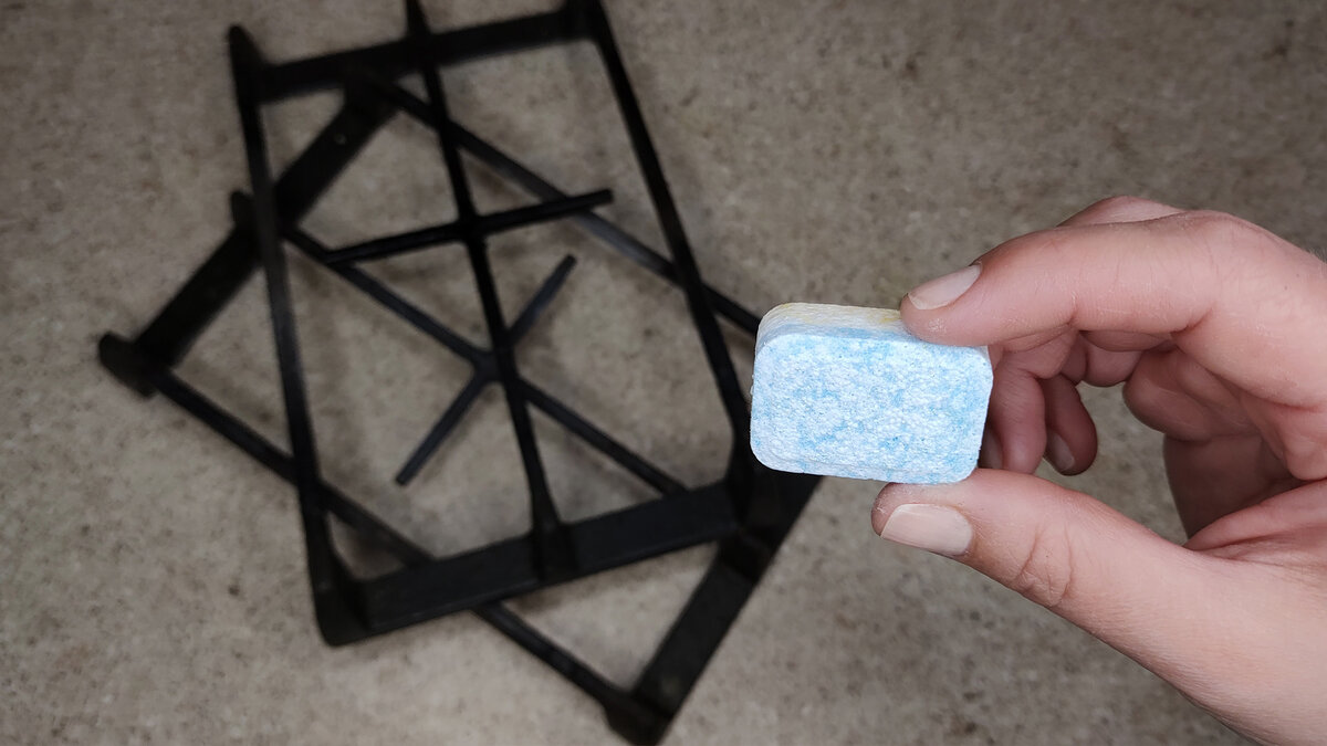 Наполните кастрюлю водой и добавьте таблетки для посудомоечной машины. После этого поставьте кастрюлю на плиту и дождитесь, пока вода закипит. Когда вода достигнет кипения, аккуратно опустите в нее решетку и оставьте на небольшом огне.