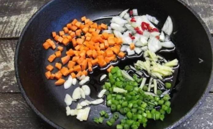 Не забудьте о главном: рис должен быть охлаждённым, чтобы избежать превращения в кашу. Идеально, если он был приготовлен заранее и хранился в холодильнике, что поможет ему держать форму при обжарке.
