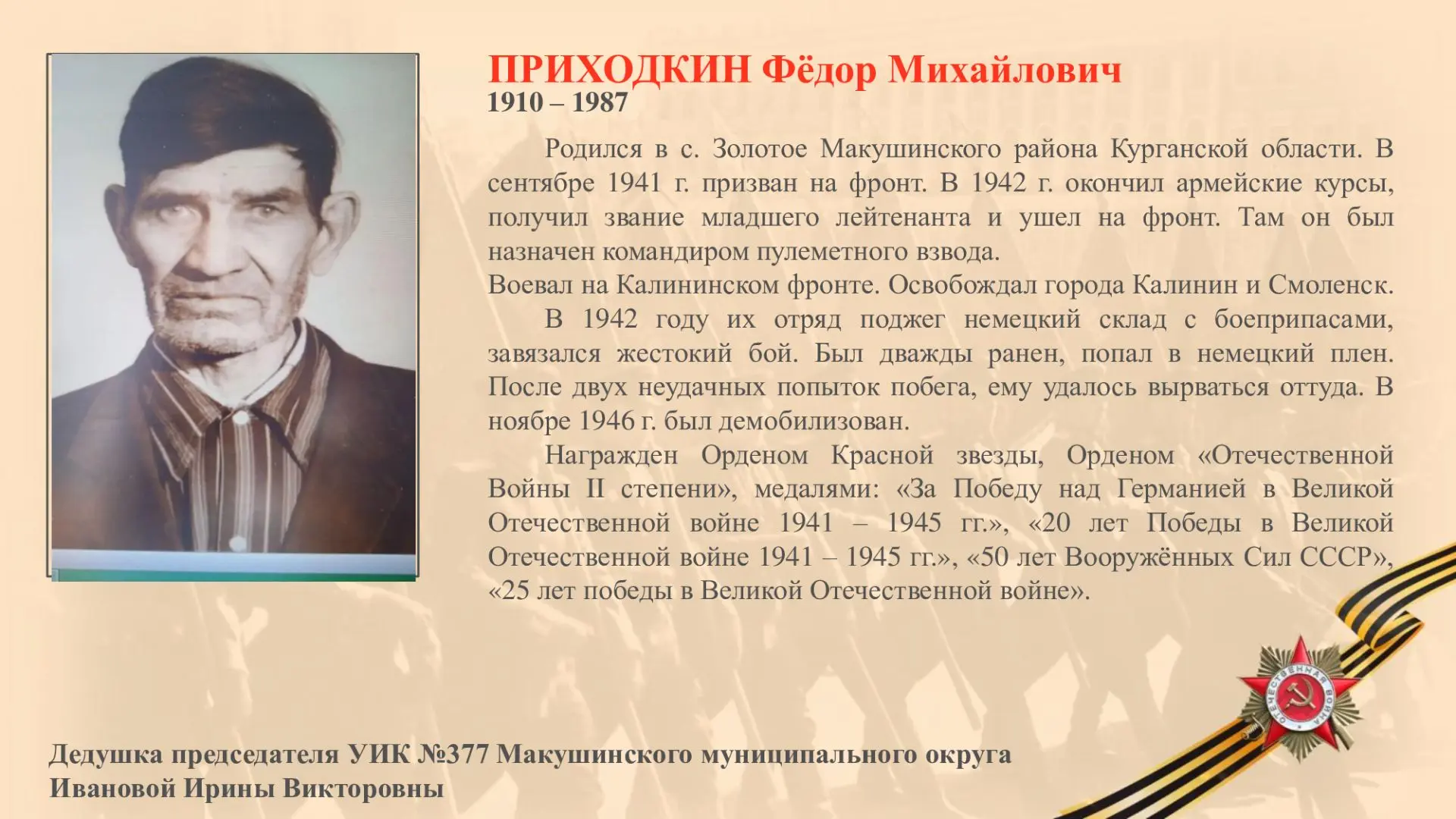 Приходкин Фёдор Михайловичдедушка председателя УИК №377 Макушинского муниципального округа Ивановой Ирины Викторовны.