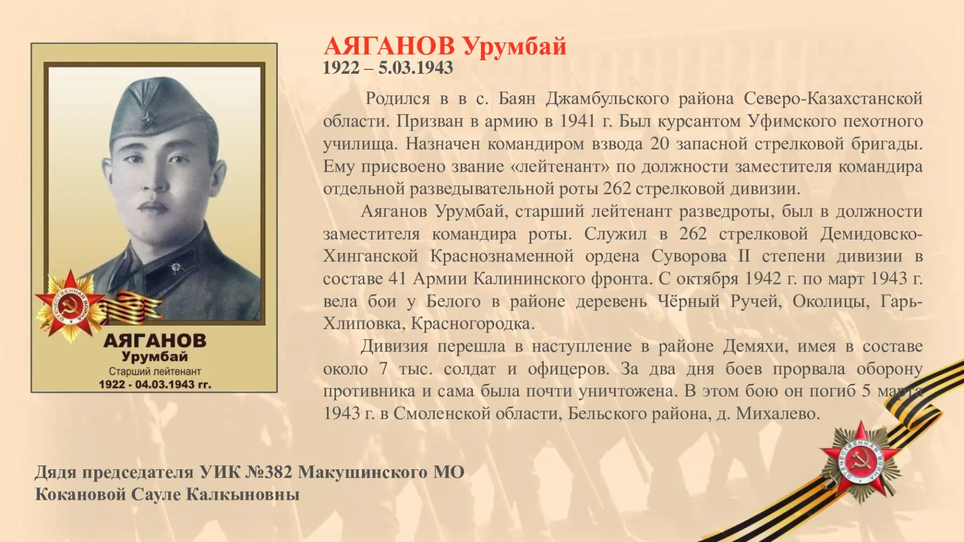 Аяганов Урумбай – старший лейтенант разведроты, был в должности заместителя командира роты, служил в 262 стрелковой Демидовско-Хинганской Краснознаменной ордена Суворова II степени дивизии в составе 41 Армии Калининского фронта. С октября 1942 г. по март 1943 г. она вела бои у Белого в районе деревень Чёрный Ручей, Околицы, Гарь-Хлиповка, Красногородка.