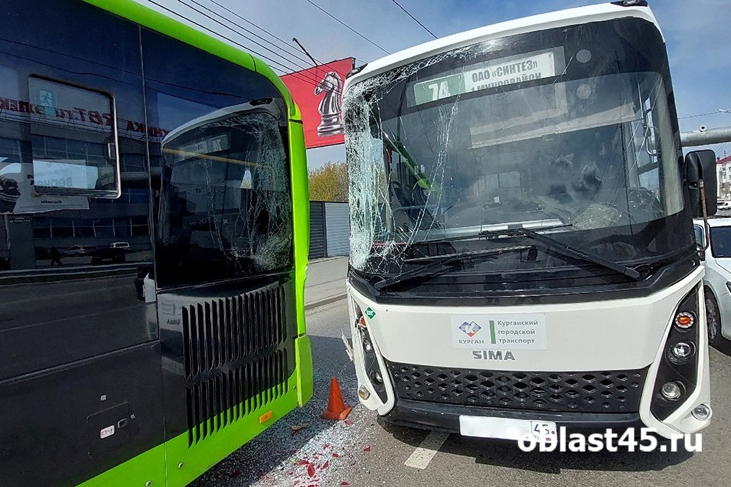 В Кургане сегодня днём произошло ДТП с участием двух автобусов. По сообщению очевидцев, столкнулись автобусы №64 и №74.