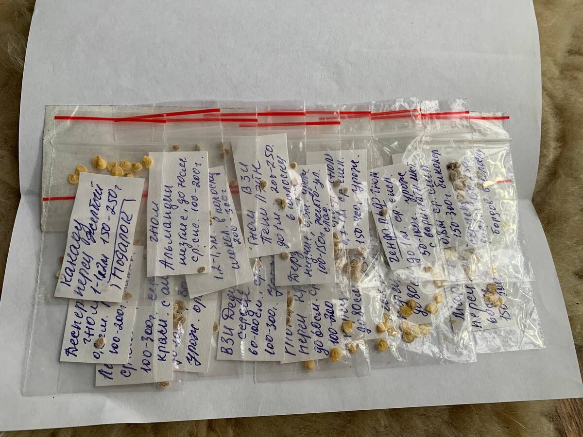Посылка пришла аккуратно упакованной в стандартный конверт. Однако, качество упаковки заслуживало похвалы: каждый сорт был помещён в отдельные зип-пакеты, надежно закрепленные на малярном скотче. Важно отметить, что к каждому пакету была прикреплена информация о высоте, массе, цвете плодов и сроках созревания – работа коллекционера была выполнена на высшем уровне.