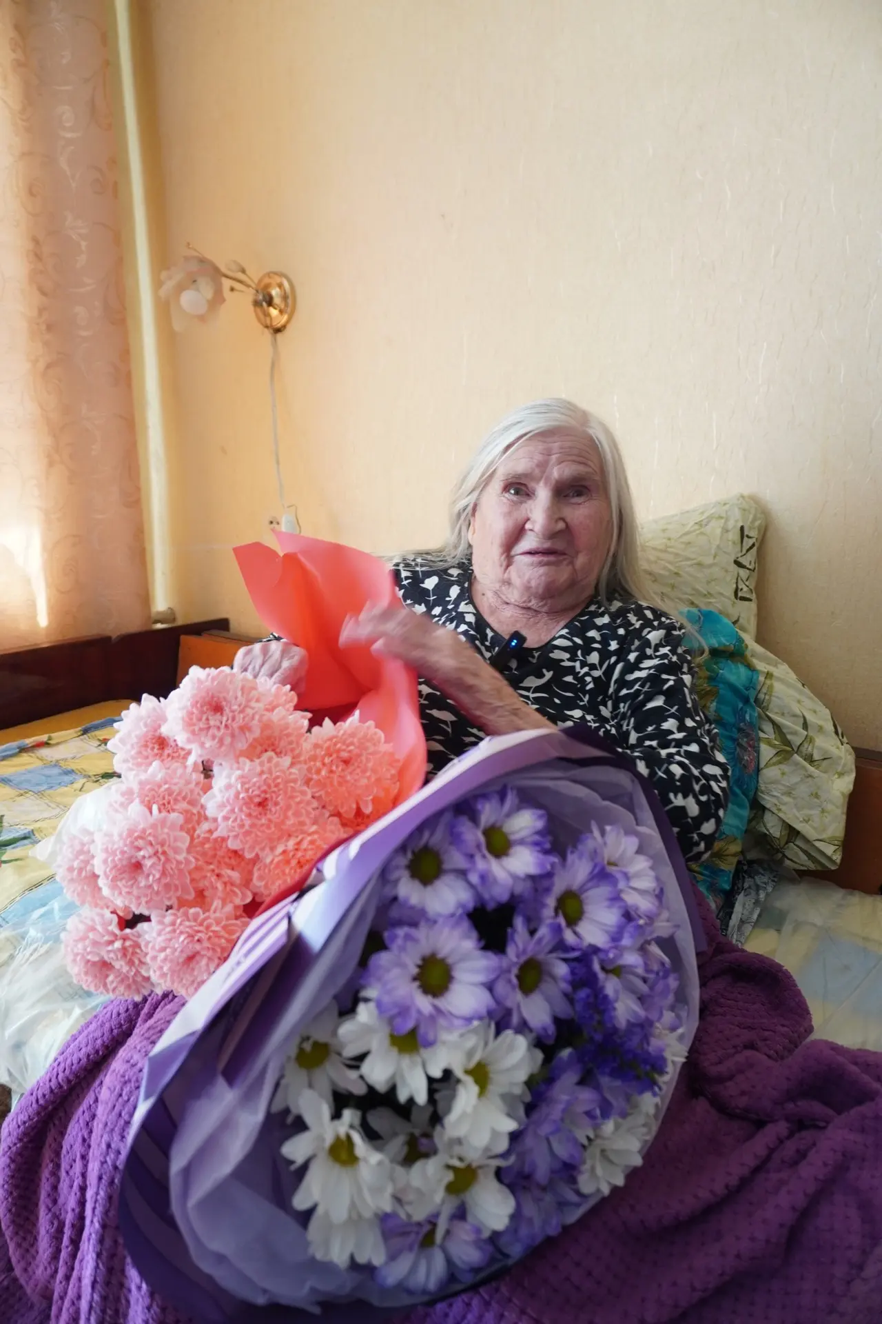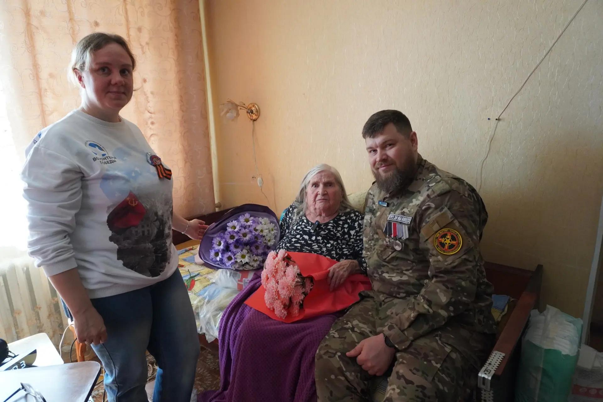 В рамках акции «Встреча победителей с наследниками Победы» поздравили ветерана специалисты Курганского Дома молодежи, участник специальной военной операции, ветеран боевых действий, кавалер Ордена Мужества, награжденный почетной медалью «За отвагу», лектор общества «Знание» Сергей Жданов, руководитель Всероссийского общественного движения «Волонтеры Победы» города Кургана Светлана Менщикова. Сергей Жданов пожелал Фаине Андреевне крепкого здоровья, весеннего настроения и вручил букет цветов.