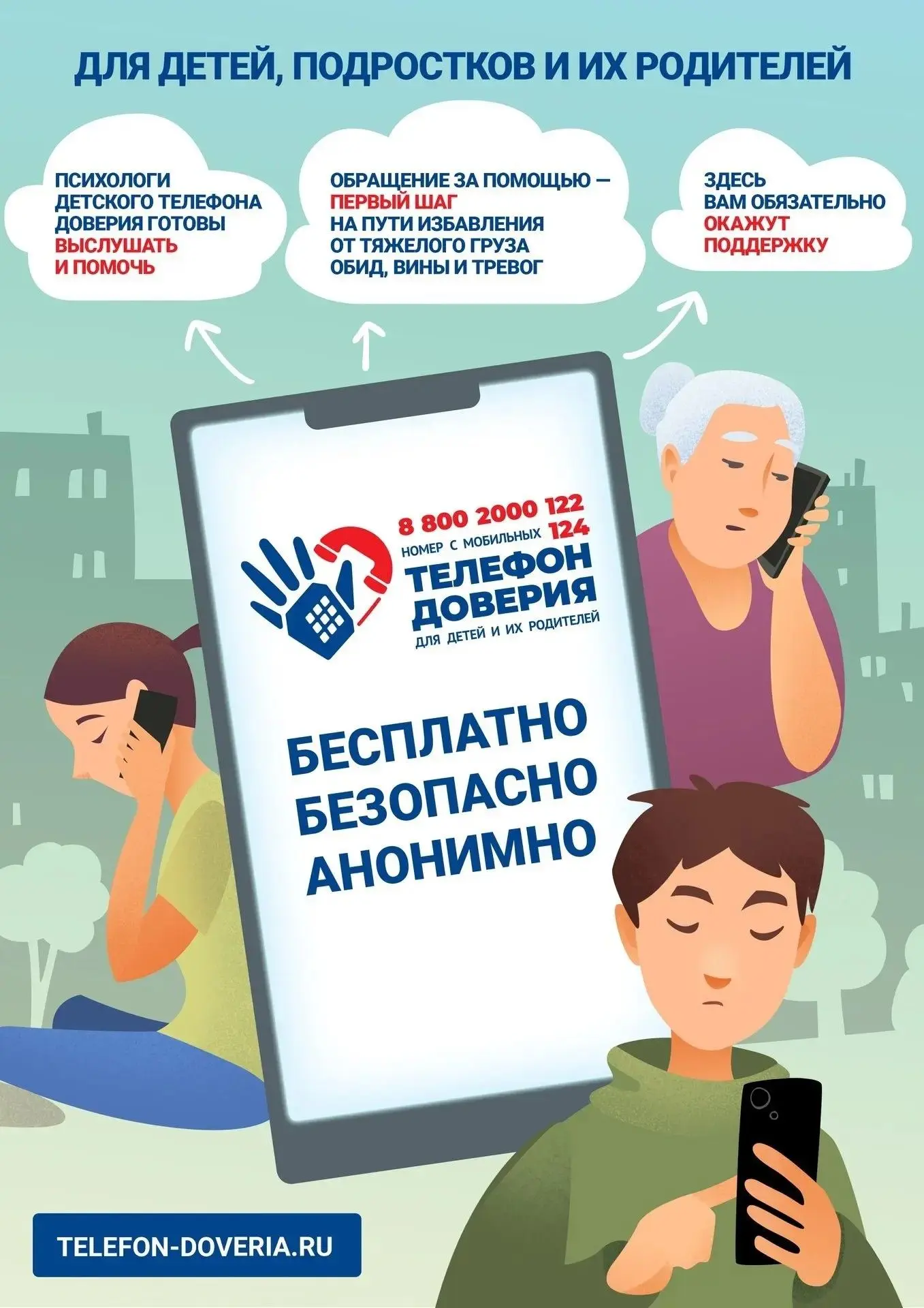 Общероссийский детский телефон доверия 8-800-2000-122 работает для детей, подростков и их родителей бесплатно и круглосуточно. Звонок анонимный.